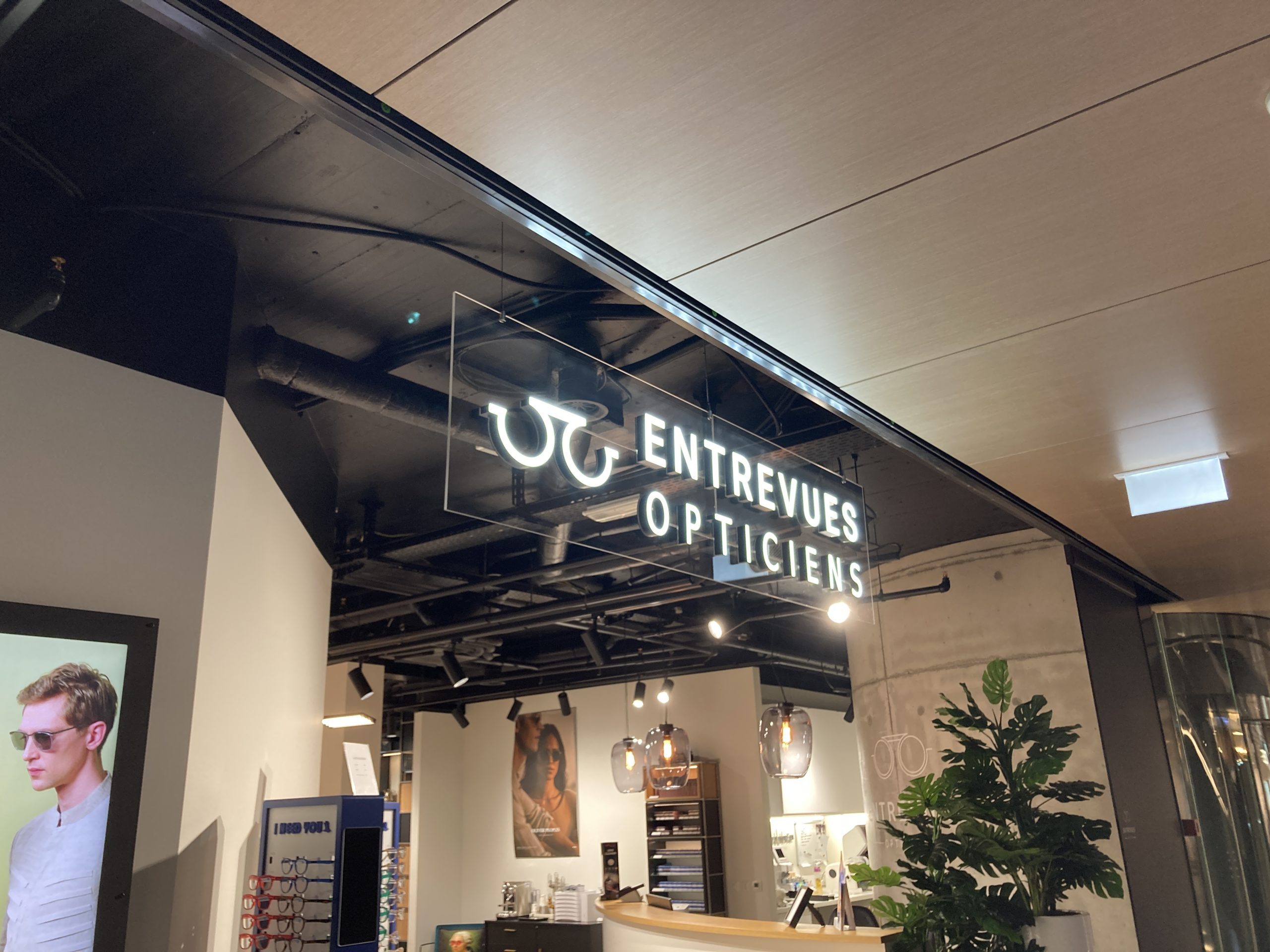 Chaque enseigne, d’une profondeur de seulement 25 mm, est montée sur verre. Ce choix matériel maximise la légèreté et la transparence. Le verre, élégant et durable, assure aussi une excellente visibilité sans surcharger l’espace visuellement.